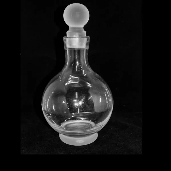 Bolfles met glazen stop. Fles gemaakt van helder glas met matglazen stop. Inhoud ca. 1 liter. Hoogte fles (exclusief stop) ca. 20 centimeter. Doorsnede fles ca. 11 centimeter. Totale hoogte fles inclusief stop ca. 25 centimeter.