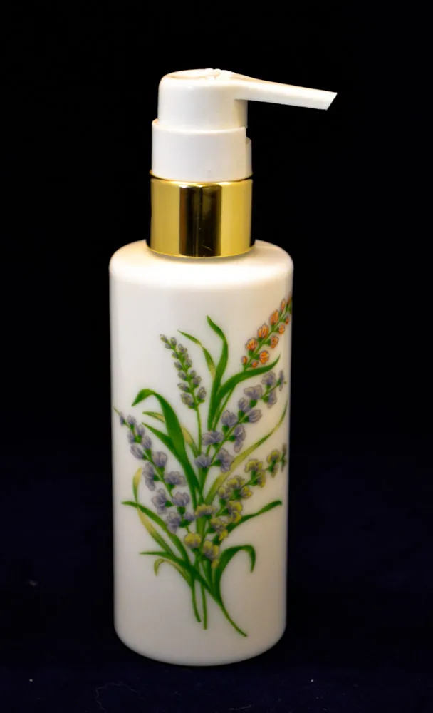Dispenser met pastelkleurige bloemen: Witte glazen dispenser met een decoratie van pastelkleurige bloemen in lila, geel en rood met groene blad. De dispenserpomp is wit met een goudkleurige ring.
