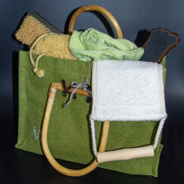 Jute tas badproducten groene badroos: Een handige jute tas met bamboe handvaten met in de tas diverse badproducten.